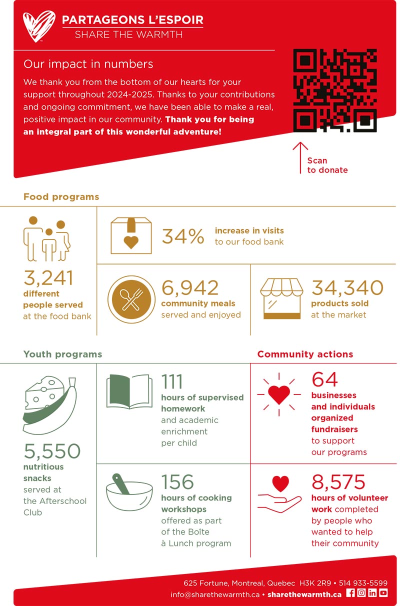 Above is a summary of our impact over the last year. To read the full annual report and learn more about our programs and our impact in the community, please click on the links to your left. You can also consult the annual reports from previous years.